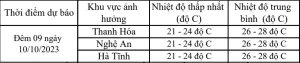 Dự báo khoảng đêm 09/10, bộ phận không khí lạnh này sẽ ảnh hưởng đến khu vực Bắc Trung Bộ. Gió Đông Bắc trong đất liền mạnh cấp 2-3; vùng ven biển cấp 3-4.