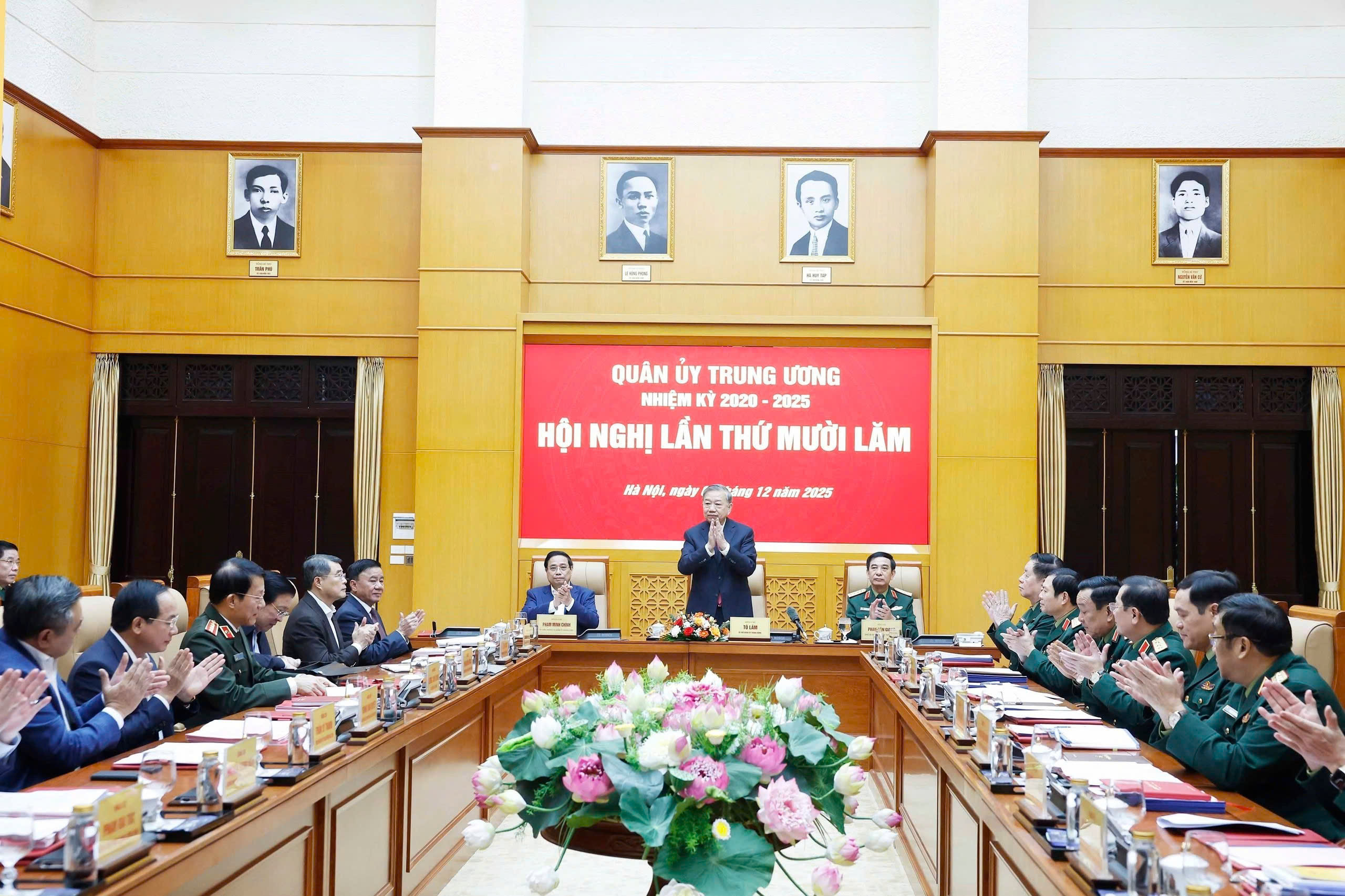 Phát biểu kết luận, Tổng Bí thư Tô Lâm, Bí thư Quân ủy Trung ương, khẳng định năm 2025, dưới sự lãnh đạo, chỉ đạo của Đảng, Nhà nước, trực tiếp là Quân ủy Trung ương, Bộ Quốc phòng, toàn quân đã thực hiện thắng lợi nhiệm vụ quân sự, quốc phòng và xây dựng Đảng bộ Quân đội trong sạch, vững mạnh.